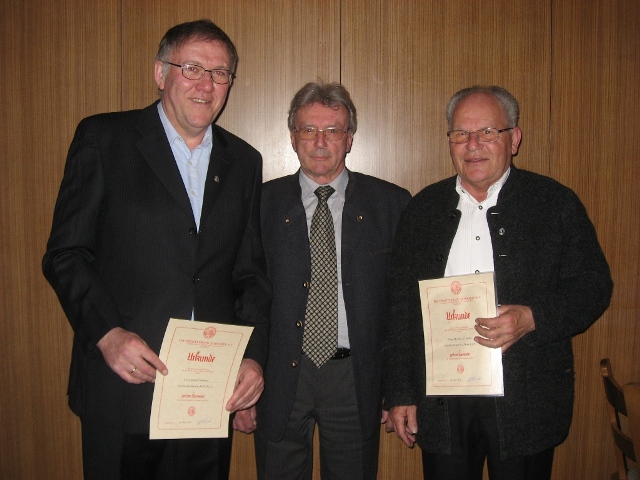 Jahreshauptversammlung: Für besondere Verdienste um die Fischerei im Landkreis bekam Vorsitzender Rudolf Heinrich (links) die goldene Vereinsnadel von Erich Thren vom Fischereiverband Schwaben (mitte) überreicht. Ebenso Michael Schweiger für 50 Jahre Vereinszugehörigkeit (rechts).