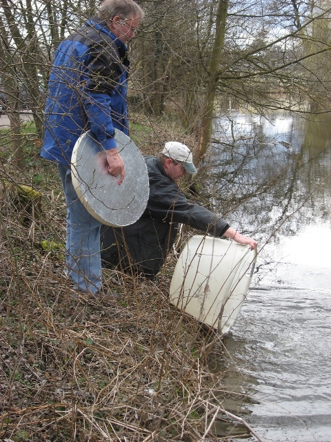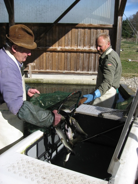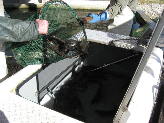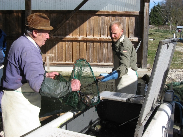 Forellenbesatz: Vom Teich in den Wasserbehälter.