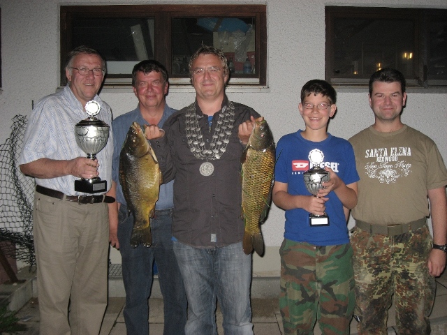 Königsfischen: Vorstand Rudolf Heinrich, Kurt Widmann (Dritter), Fischerkönig Thomas Wörle, Jungfischerkönig Korbinian Altmann und der zweitplatzierte Christian Goldstein (von links).