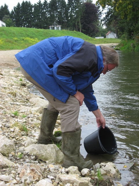 Forellenbesatz: Schriftführer Karl Gerum beim Besatz. Links Vorstand Rudolf Heinrich.