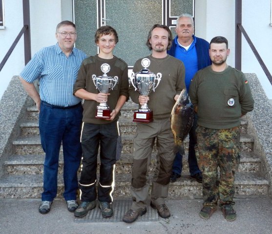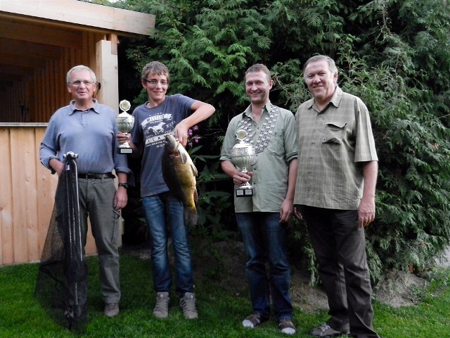 Anfischen: Vorstand Rudolf Heinrich, Tobias Stich (Erster bei den Jungfischern), erster Marcel Springer, drittplatzierter Werner Heckenstaller und zweiter Christian Goldstein (von links).