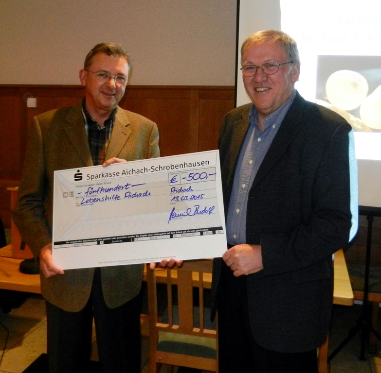 Hauptversammlung: Bei der 120-Jahr-Feier des KFV Aichach im vergangenen Jahr wurde eine Spendensau aufgestellt. Dieser Betrag wurde auf 500 Euro aufgestockt. Der Scheck wurde an Herbert Behmenburg, stellvertretender Vorsitzender der Lebenshilfe Aichach-Friedberg (links), von Vorstand Rudolf Heinrich übergeben.