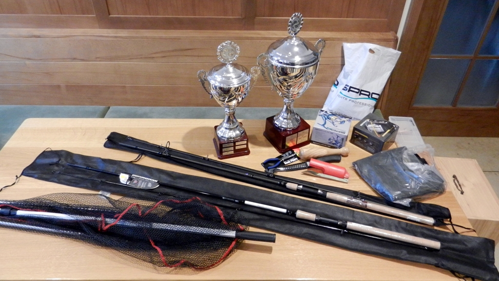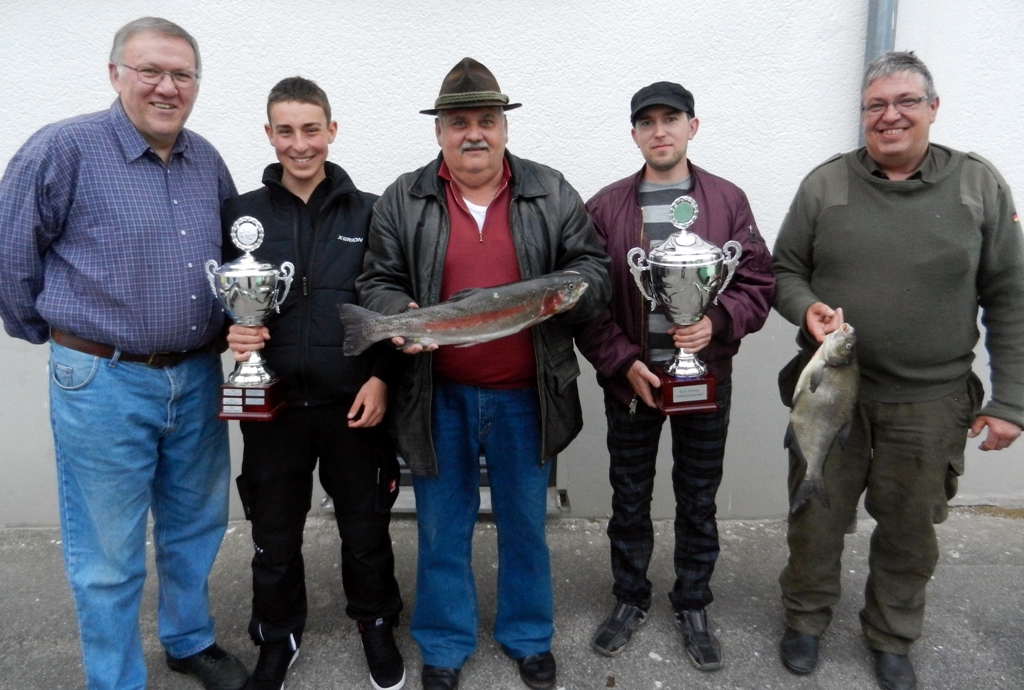 Anfischen: Von links Vorstand Rudolf Heinrich, Maximilian Eigner (Gewinner des Jugendpokals), Werner Heckenstaller (zweiter) mit einer sehenswerten Regenbogenforelle, Marco Nielfa-Kettler (erster) und Josef Altmann (dritter) mit einer Brachse.