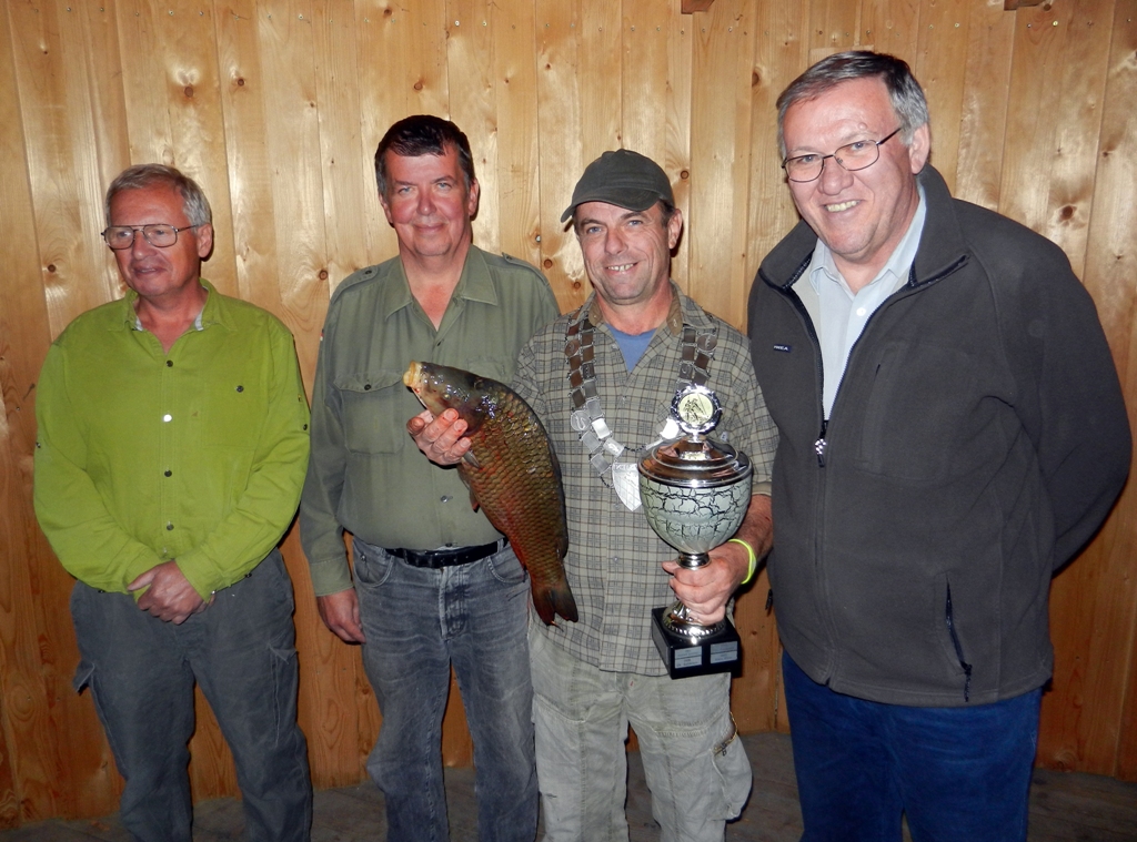 Königsfischen: Von links Peter Held (dritter), Kurt Widmann (zweiter), neuer Fischerkönig Uwe Vulturius mit einem Schuppenkarpfen (2442 Gramm) und Vorstand Rudolf Heinrich.